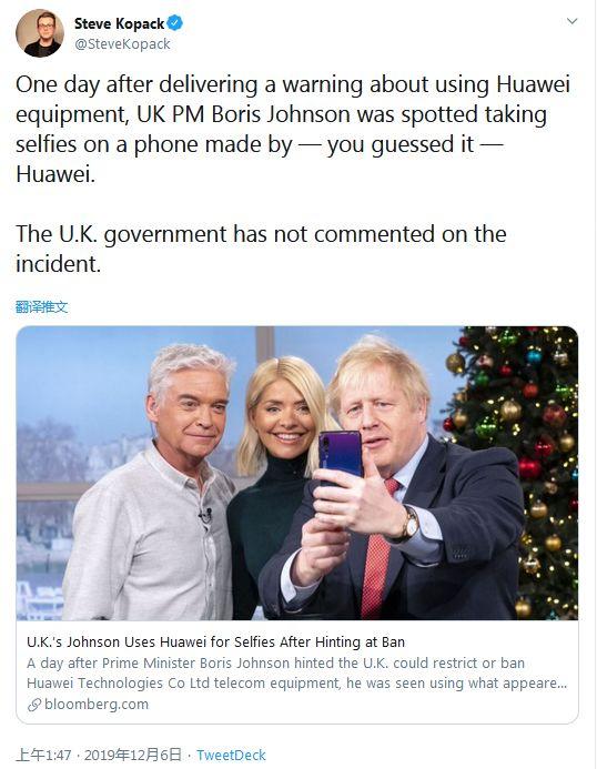 值得注意的是,5日當天,約翰遜還在個人推特上發布了這張用華為手機與兩名節目主持人自拍合影的照片。 ↓